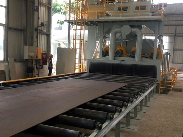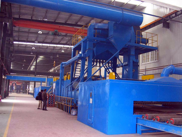 鋼板預(yù)處理線拋丸機主要由輥道輸送系統(tǒng)、拋丸清理機、自動噴漆系統(tǒng)、烘干室、拋丸除塵系統(tǒng)、漆霧過濾系統(tǒng)和電控系統(tǒng)所組成,并可擴展自動上卸料系統(tǒng)和預(yù)熱室。